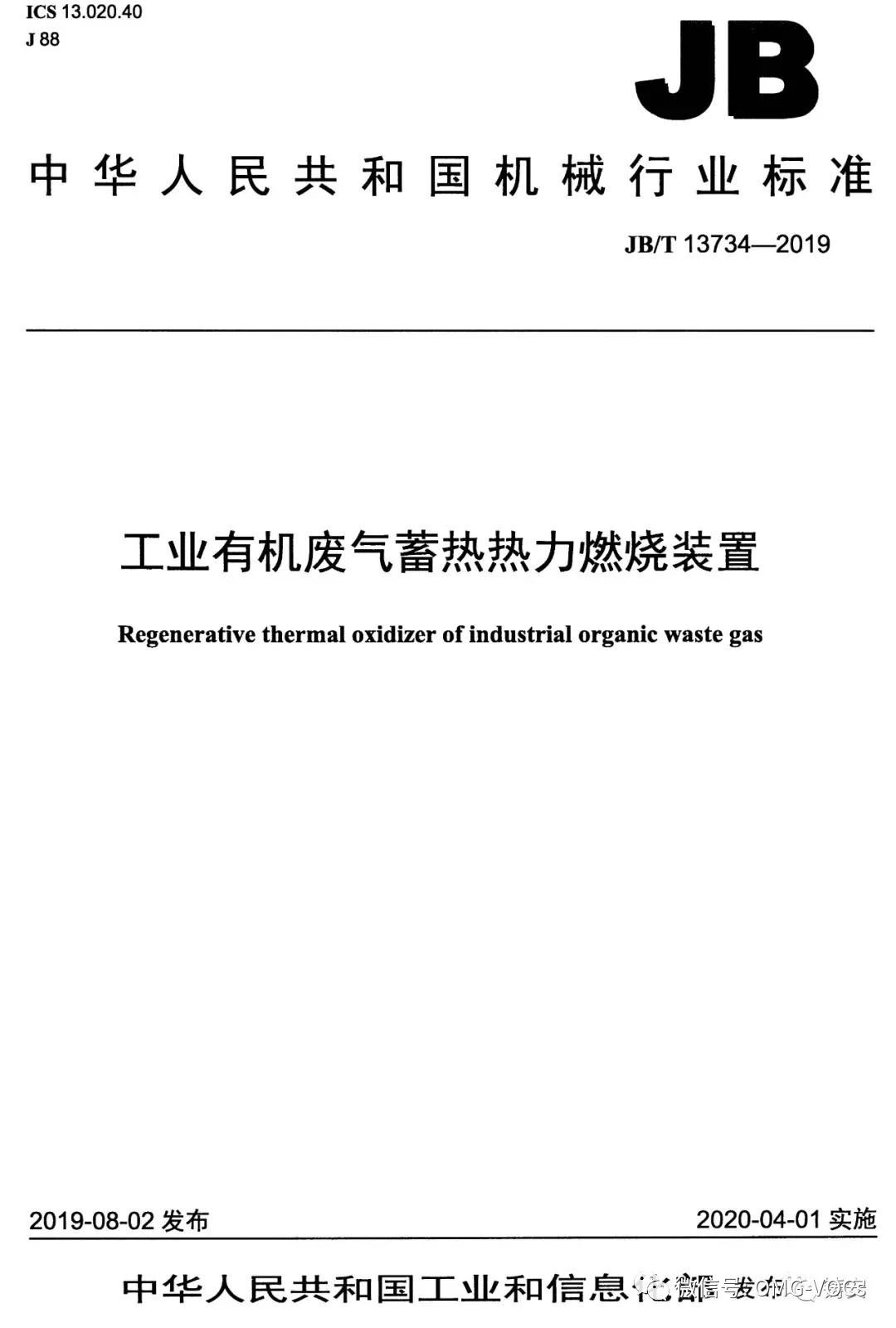【标准】全文:《工业有机废气蓄热热力燃烧装置》(JB/T 13734-2019)