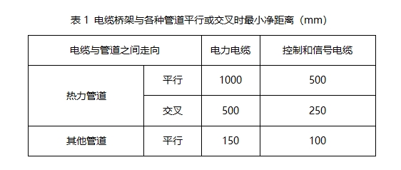 8、电缆桥架与各种管道平行或交叉时,其最小净距离应符合表1的规定。