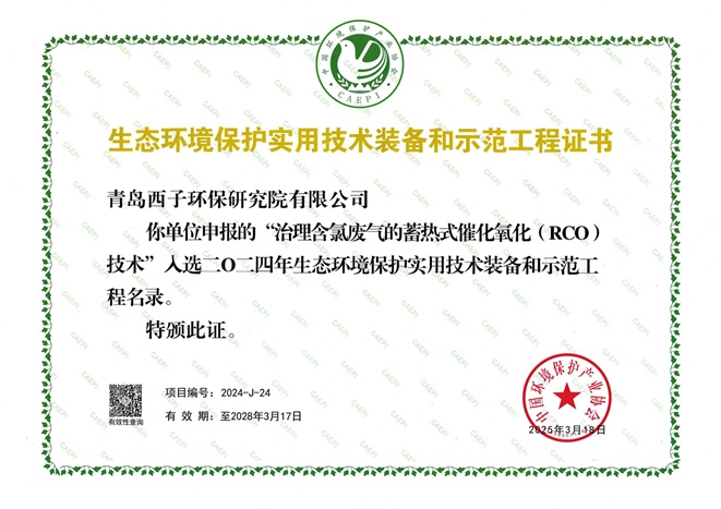 近日,中国环境保护产业协会正式发布“2024年生态环境保护实用技术名录”,青岛西子环保研究院有限公司的“治理含氯废气的蓄热式催化氧化(RCO)技术”凭借其卓越的技术创新性和显著的环保效益成功入选。